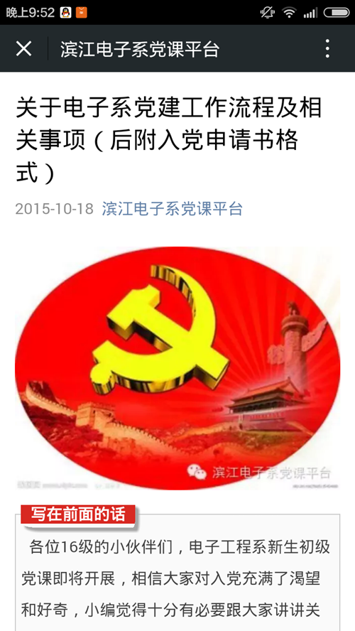 近日,为提高新媒体环境下党建工作的影响力,结合2015级新生初级党课教学,电子工程系第一、二学生党支部党团携手利用微信公众平台助力初级党课教育。