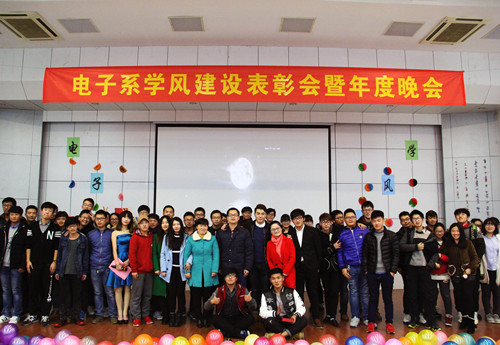 12月10号晚,电子工程系师生在滨江学院报告厅欢聚一堂,电子系学风建设表彰晚会正在这里举办。电子系学办主任李俊平老师,团总支书记王恋老师以及辅导员代表余寅老师莅临现场。