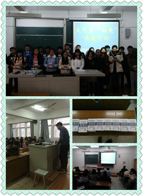 在助爱第一环节“送字典、助我学”中,陈凯峰老师,将大气系辅导员自发购买的英语词汇字典赠送给每一位特困生,鼓励他们努力学习,成人成才。助爱第二环节“爱的传播、学的传承”中,高年级困难生将自己使用过的计算机二级、英语四六级资料,高数笔记以及一些选修课的书籍,分别赠送给有需要的低年级困难生手中。手捧资料的学生深深感到,这传递的是爱心,更是知识的传承。