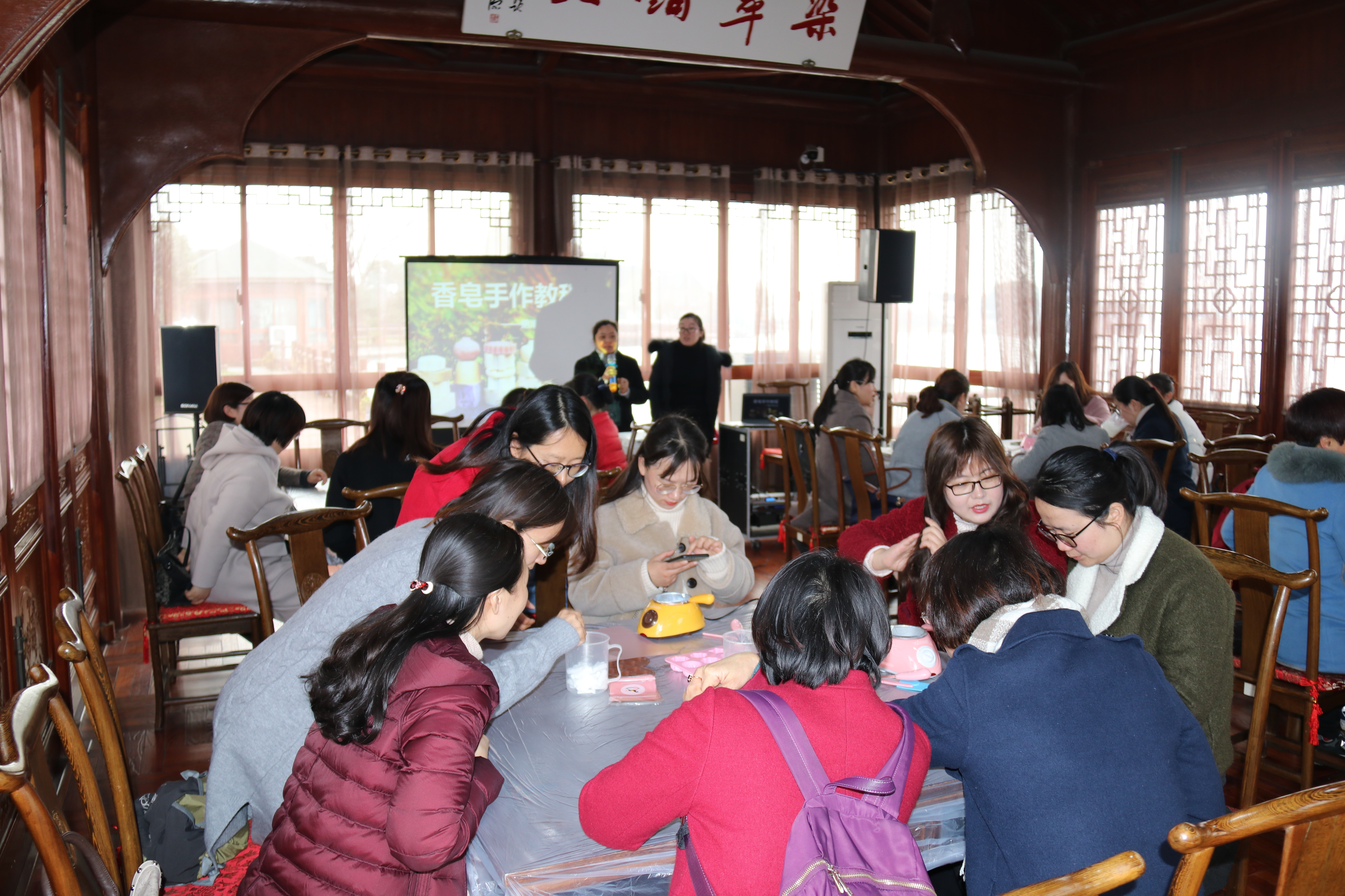 首先大家参加了一次别开生面的手工DIY精油皂活动。在耐心听完老师的讲解后,女教职工们都非常兴奋,跃跃欲试。大家充分发挥团队合作精神,有的忙着整理各种材料,有的进行精细切割,有的负责不断搅拌,分工明确,有条不紊。大家一边制作精油皂一边品着砌泡过的玫瑰花茶,很是悠然惬意。为了制作出款式独特新颖的精油皂,每个人都认真投入、仔细揣摩、反复调试,一块块形状各异、味道芳香、颜色或淡雅或鲜亮的精油皂就呈现在桌面上,大家纷纷为用手机或照相机留下了这些小作品永恒的美。同时,各小组间也相互观赏对方的作品,大家感叹,一块小小的精油皂可以凝聚如此之多的创意。
