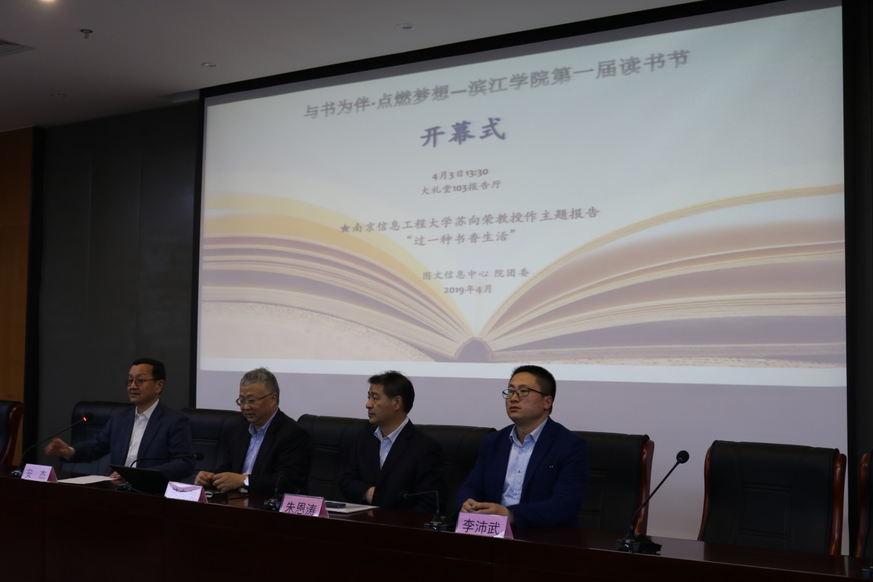 4月3日下午,以“与书为伴·点燃梦想”为主题的南京信息工程大学滨江学院(无锡新校区)首届读书节开幕式在学院大礼堂一楼报告厅举行。校本部法政学院苏向荣教授应邀出席,图文信息中心、院团委、教务处部门负责人以及学院200多名师生代表参加了开幕式。会议由图文信息中心主任安杰主持。