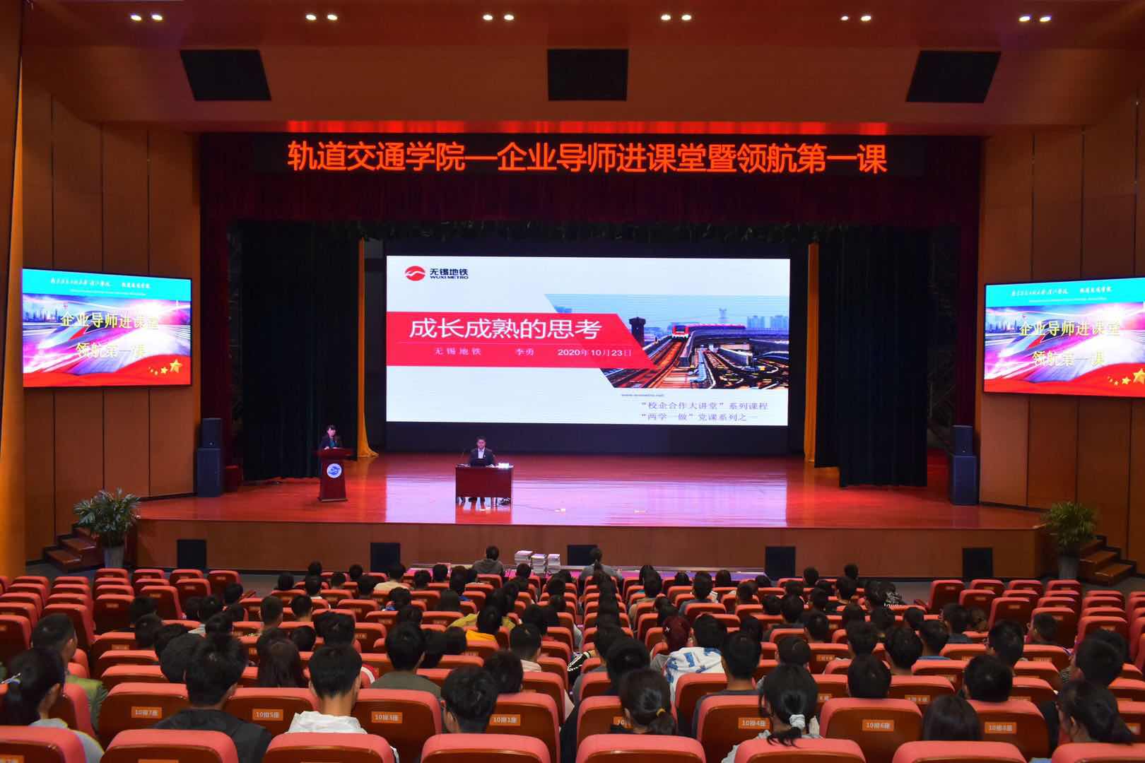 10月23日晚,轨道交通学院企业导师进课堂暨领航第一课活动在滨江大礼堂二楼报告厅举行,活动邀请无锡地铁集团有限公司审计部部长李勇和滨江学院保卫处处长朱广革走进课堂,给全体2020级新生带来精彩丰富的“第一课”。