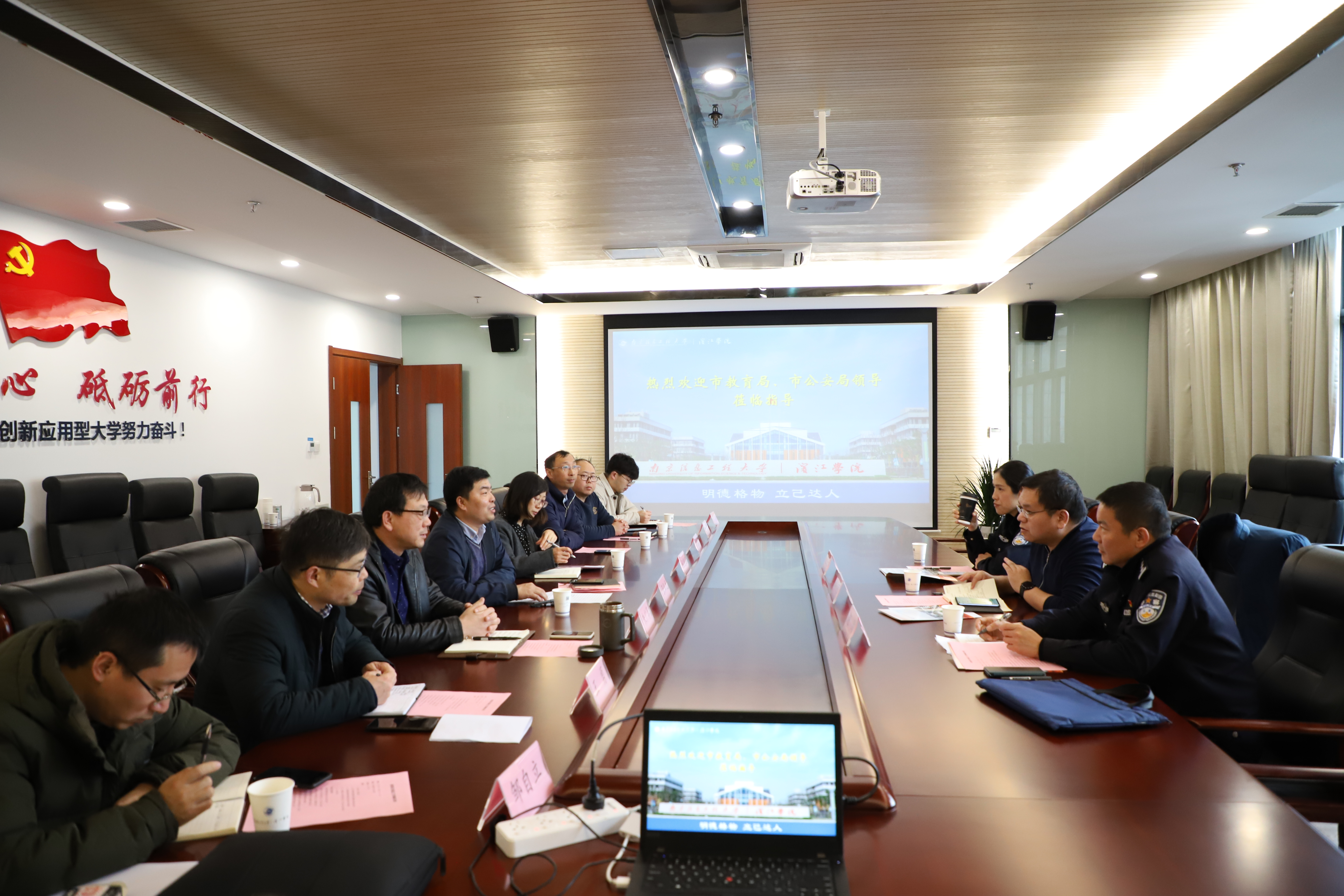 张灿龙副书记首先对邵小明处长、赵剑队长一行的到来表示热烈欢迎。他介绍了滨江学院的历史沿革、人才培养、转设进程等基本情况,重点介绍了我院在校园安全稳定方面所做的工作和“安全第一、预防为主、综合治理”的校园管理理念,并就市教育局、市公安局领导对我院转设工作、校园安全工作给予的指导和支持表示感谢。