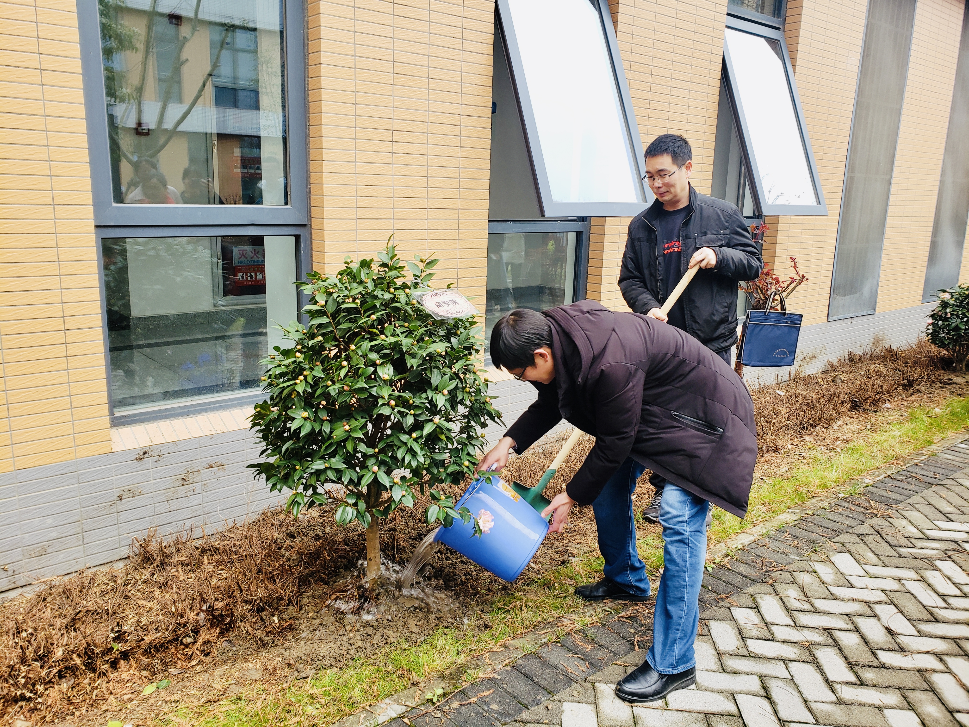 18级各专业学子在领取山茶花后便劳作起来,朱广革处长、陈理飞院长、孙振书记与各辅导员也参与了山茶花的种植。大家在总务处的指导与帮助下圆满完成了今年植树节的活动,一簇簇山茶花在尚美楼扎根生长。今日师生们种下的这棵幼苗,将承载着大家对新学期的美好期盼,在霏霏春雨与微微春风中茁壮成长。