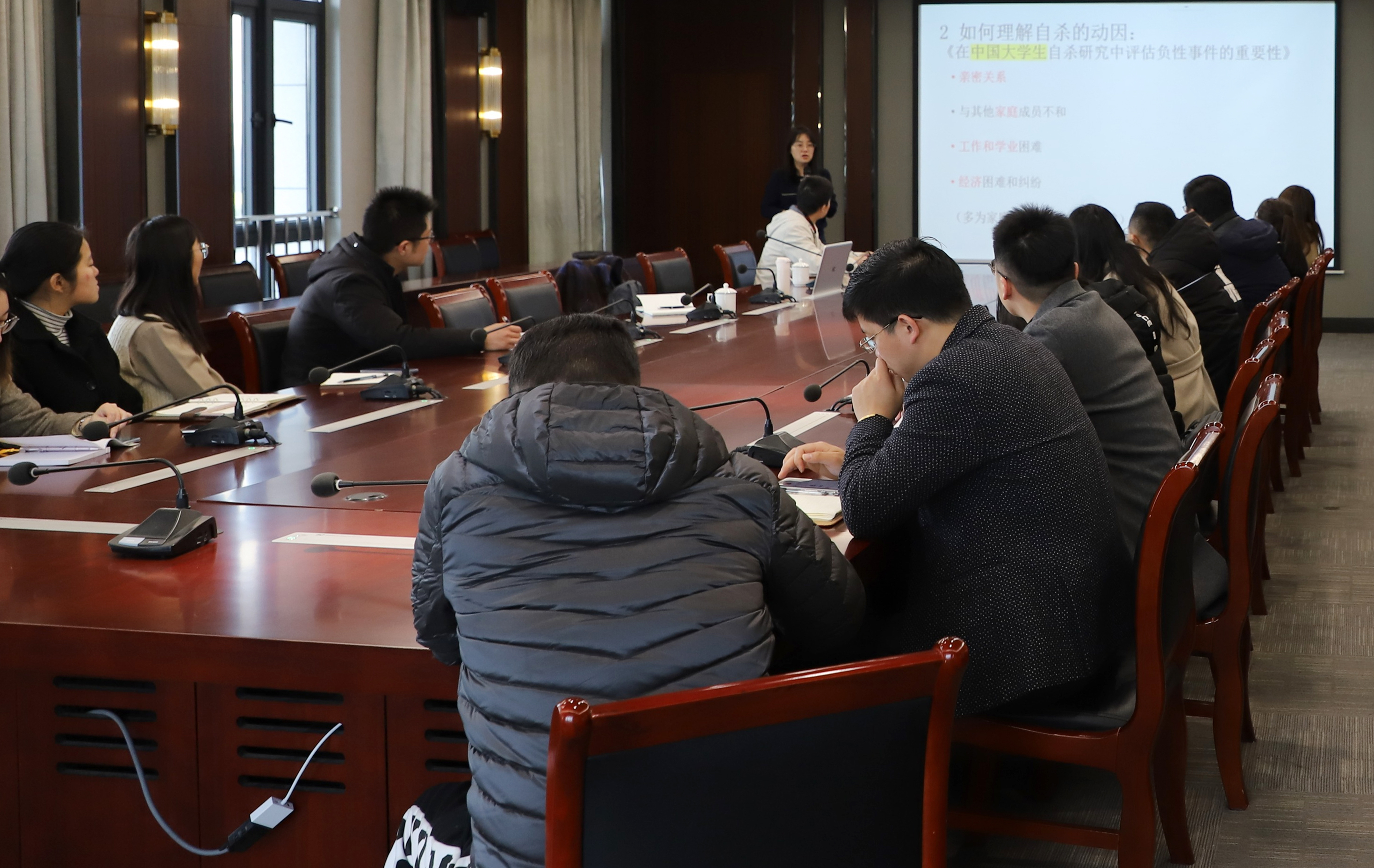 3月17日上午,我院在行政楼525会议室举办大学生心理危机干预专题培训会。南京师范大学心理学系主任安媛媛副教授应邀为我院全体辅导员作专题培训。本次培训由学生工作处副处长、团委书记李沛武主持。