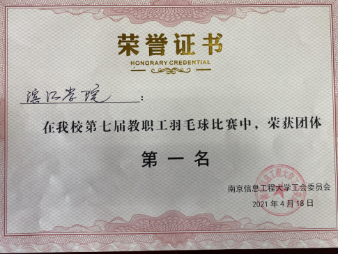 4月18日,南京信息工程大学第七届教职工羽毛球比赛在校运动馆举行,共有26支代表队参加比赛。我院由党委副书记、副院长张灿龙任领队,纪委书记李步浩及宋巨华、刘兰财、周有芬、李君、方胜、王畅、鲍文君等14名老师组队参赛。比赛中,我院参赛队员精诚协作、顽强拼搏、连克强敌,最终荣获本次比赛团体第一名。