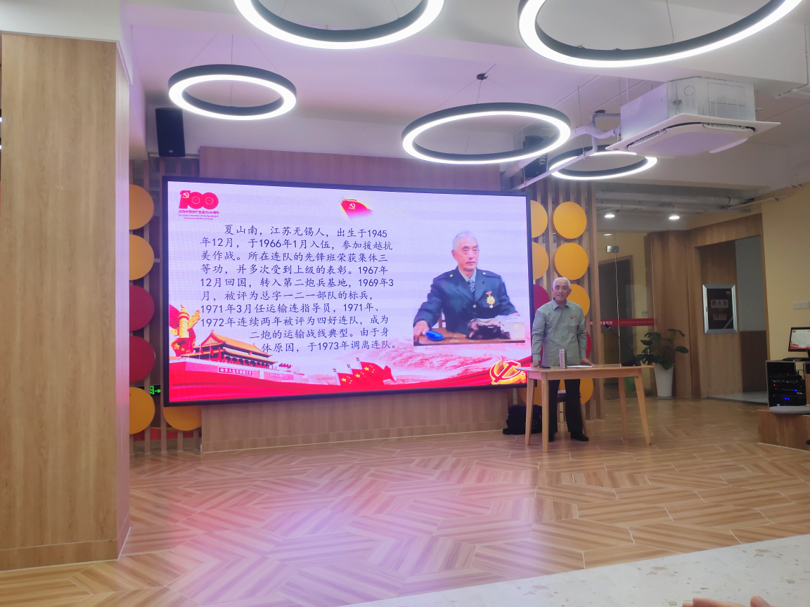 本次党日活动由物联网工程学院党总支首次联合安镇街道社区支委会开展,活动邀请了无锡市抗美援越老兵夏山南。活动现场,夏山南老人讲述了自己参加抗美援越战争的经历和故事,在长达一个多小时的讲述过程中,夏老身着军装,全程站立,声音洪亮,精神抖擞,带领大家重温了那段炮火纷飞、硝烟弥漫的峥嵘岁月,为大家上了一堂生动的党史课。