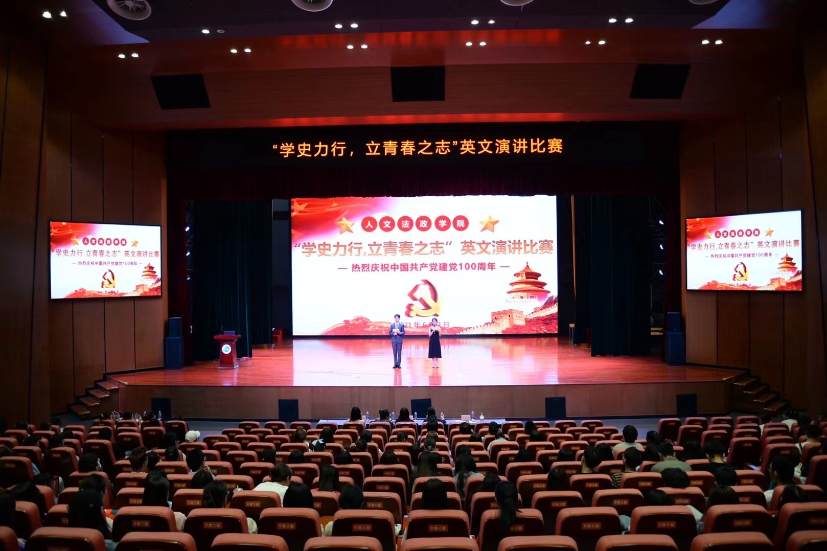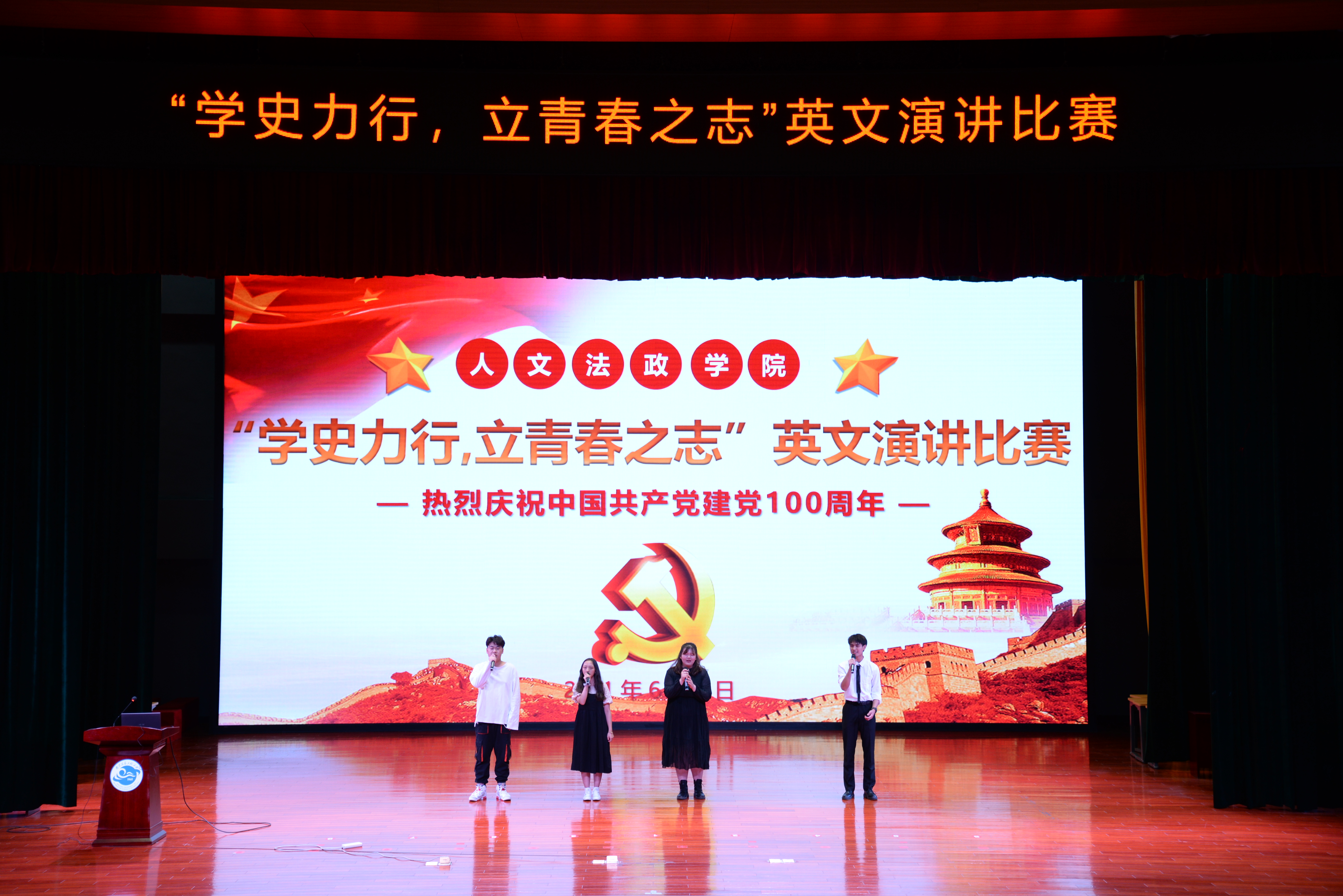 今年是中国共产党建党100周年,为了庆祝党的百年华诞,纪念党的丰功伟绩,加强学生思想政治教育和党性修养,人文法政学院于6月2日在大礼堂二楼报告厅举办了“学史力行,立青春之志”英语演讲比赛决赛。人文法政学院谭东峰副院长、外语系主任赵岚老师、分团委书记王琳琳老师、教学秘书殷俊杰老师、18和19级辅导员滕兆梅老师出席本次活动并担任比赛评委,全院学生到场观看本次比赛。
