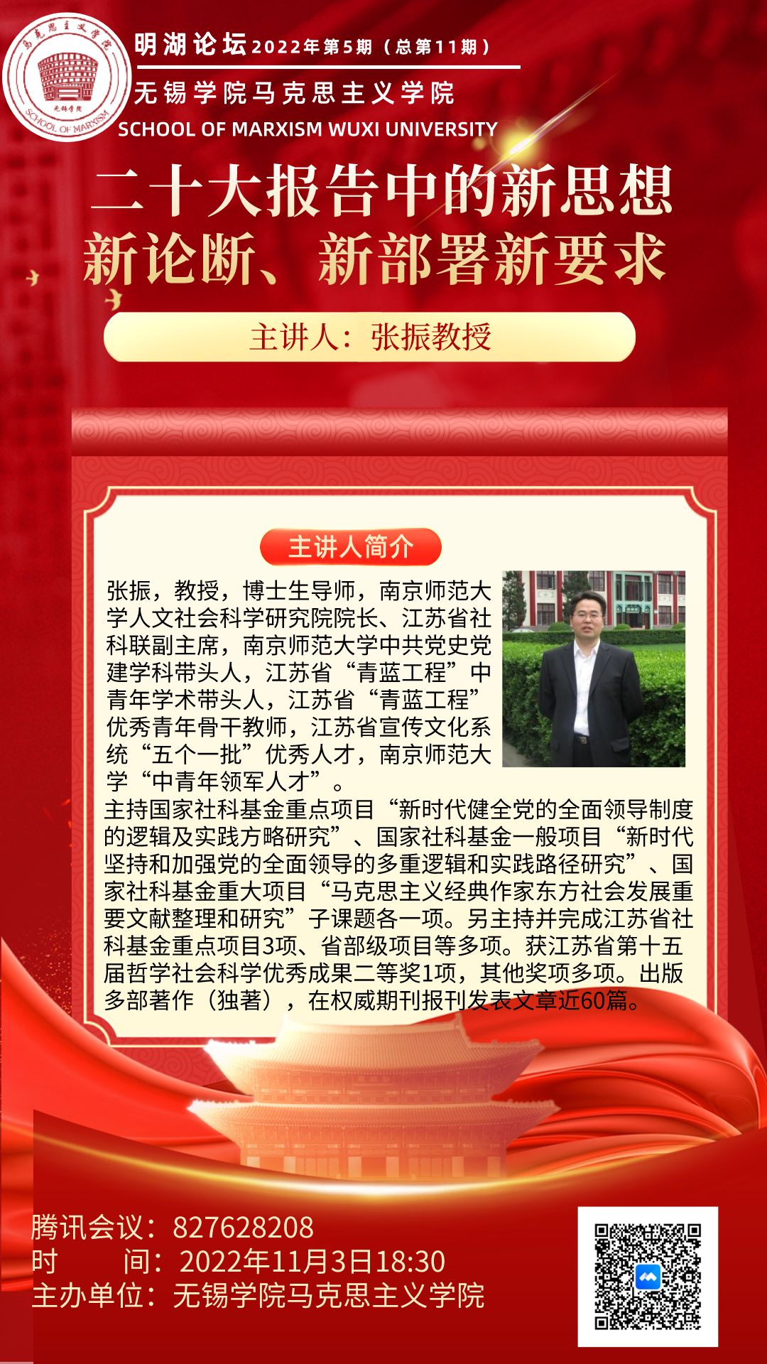 张振,教授,博士生导师,南京师范大学人文社会科学研究院院长、江苏省社科联副主席,南京师范大学中共党史党建学科带头人,江苏省“青蓝工程”中青年学术带头人,江苏省“青蓝工程”优秀青年骨干教师,江苏省宣传文化系统“五个一批”优秀人才,南京师范大学“中青年领军人才”。现为国家社会科学基金项目通讯评议专家,中国列宁思想研究会副秘书长,中国政治学学会理事,江苏省科学社会主义学会副会长,江苏省党史学会常务理事。