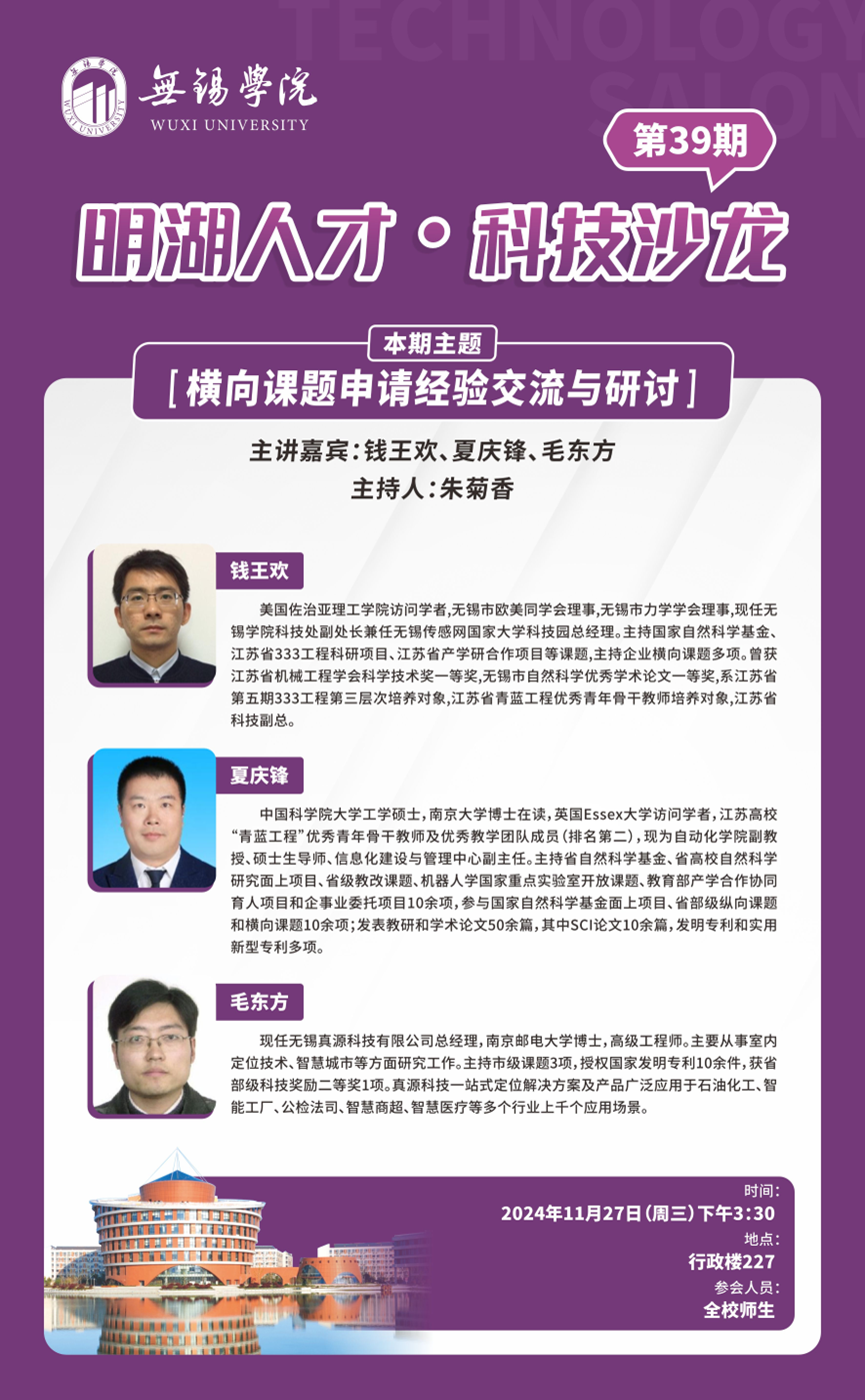 钱王欢,美国佐治亚理工学院访问学者,无锡市欧美同学会理事,无锡市力学学会理事,现任无锡学院科技处副处长兼任无锡传感网国家大学科技园总经理。主持国家自然科学基金、江苏省333工程科研项目、江苏省产学研合作项目等课题,主持企业横向课题多项。曾获江苏省机械工程学会科学技术奖一等奖,无锡市自然科学优秀学术论文一等奖,系江苏省第五期333工程第三层次培养对象,江苏省青蓝工程优秀青年骨干教师培养对象,江苏省科技副总。