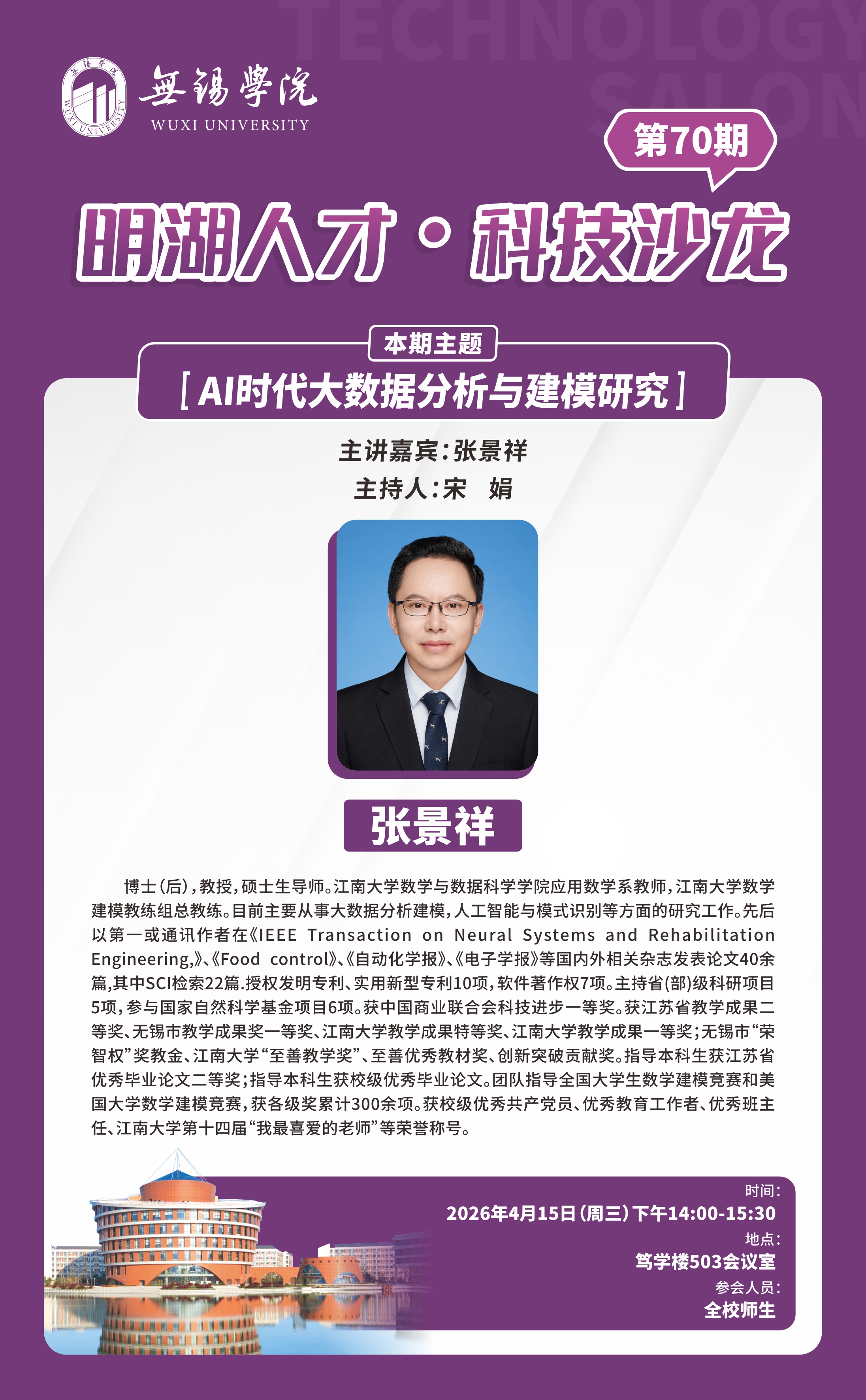 张景祥,博士(后),教授,硕士生导师。江南大学数学与数据科学学院应用数学系教师,江南大学数学建模教练组总教练。目前主要从事大数据分析建模,人工智能与模式识别等方面的研究工作。先后以第一或通讯作者在《IEEE Transaction on Neural Systems and Rehabilitation Engineering,》、《Food control》、《自动化学报》、《电子学报》等国内外相关杂志发表论文40余篇,其中SCI检索22篇,授权发明专利、实用新型专利10项,软件著作权7项。主持省(部)级科研项目5项,参与国家自然科学基金项目6项。获中国商业联合会科技进步一等奖。获江苏省教学成果二等奖、无锡市教学成果奖一等奖、江南大学教学成果特等奖、江南大学教学成果一等奖;无锡市“荣智权”奖教金、江南大学“至善教学奖”、至善优秀教材奖、创新突破贡献奖。指导本科生获江苏省优秀毕业论文二等奖;指导本科生获校级优秀毕业论文。团队指导全国大学生数学建模竞赛和美国大学数学建模竞赛,获各级奖累计300余项。获校级优秀共产党员、优秀教育工作者、优秀班主任、江南大学第十四届“我最喜爱的老师”等荣誉称号。