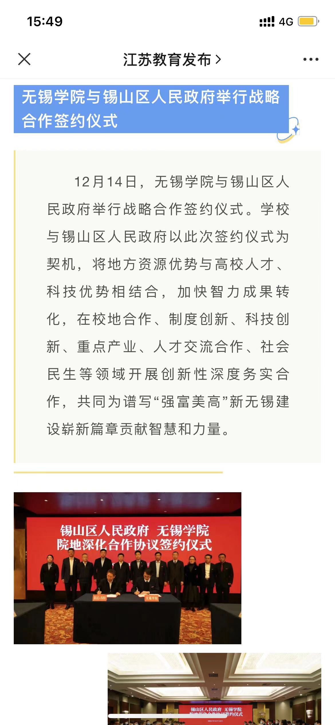 【江苏教育发布官微】无锡学院与锡山区人民政府举行战略合作签约仪式
