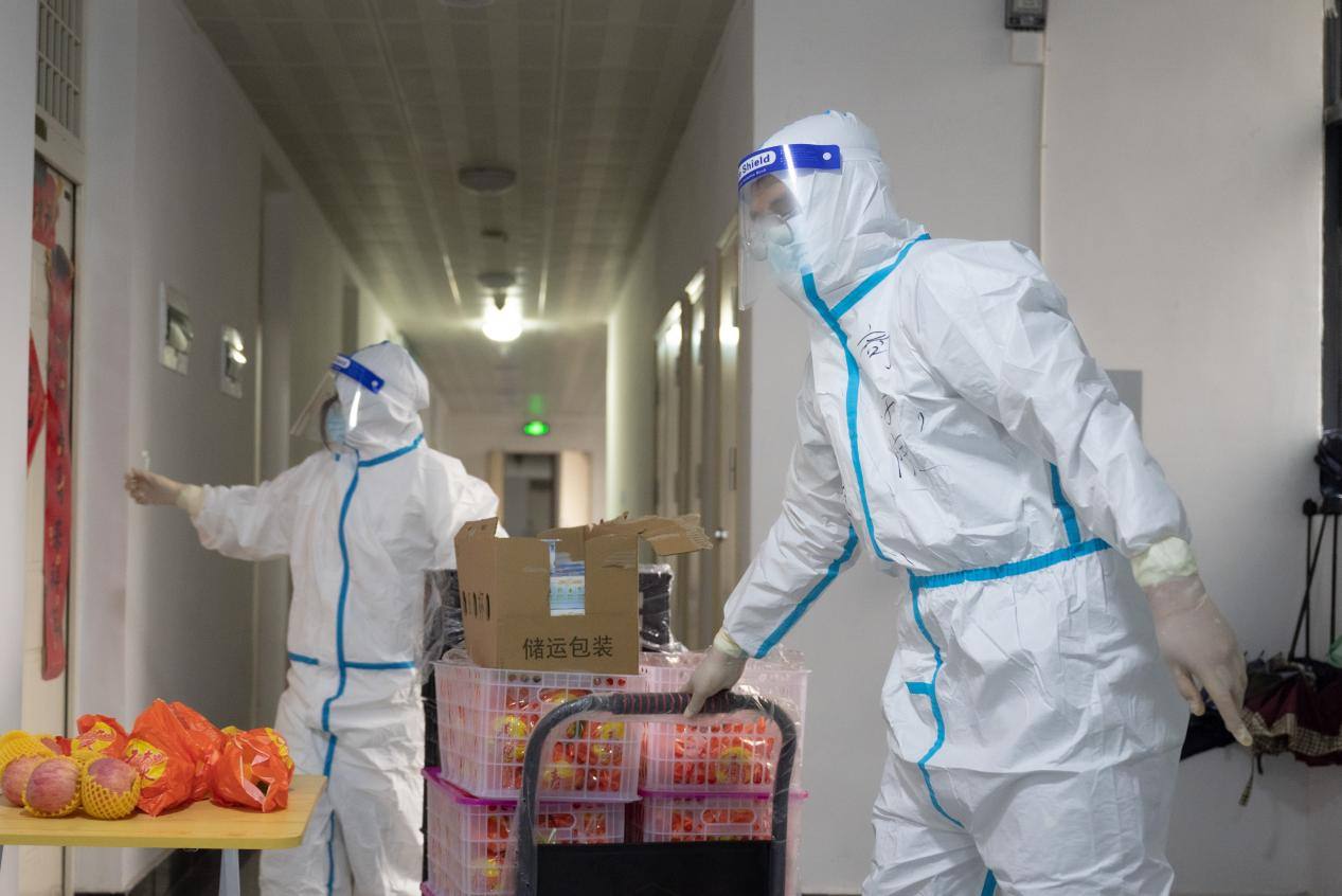 一支“大白”队伍也格外亮眼。坚守在学生工作一线的辅导员们,穿上防护服,集体化身“大白”,为健康监测楼栋的学生们配送三餐。“辅导员都是党员,也是学生的‘服务员’。我们当时就想把冒着热气的饭菜、新鲜的酸奶水果第一时间送到学生手里,所以大家手脚都很麻利,没人喊累。”