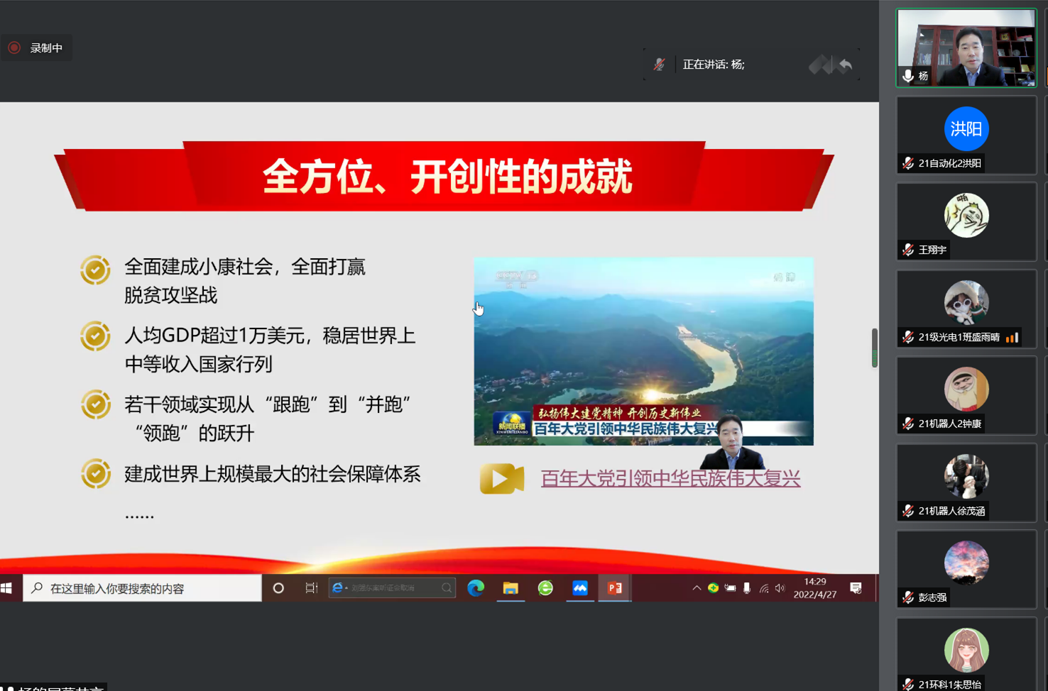 杨建新围绕“百年奋斗谋复兴——深入学习党的十九届六中全会”这一主题,着重阐述了党的十九届六中全会精神的核心要义和第三个历史性决议的内涵,分析和总结了党的百年历程重大成就和历史经验,并勉励青年学生要大力弘扬伟大建党精神,勿忘昨天的苦难辉煌,无愧今天的使命担当,不负明天的伟大梦想,争做有理想、有本领、有担当的时代青年。