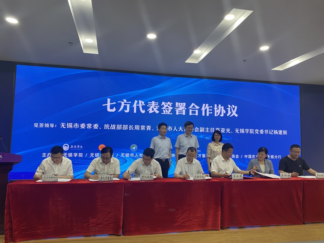 七方代表(无锡学院、无锡市侨联、无锡市人社局、无锡市科协 、市人才集团、无锡市侨商会、中国农业银行无锡分行)签署合作协议
