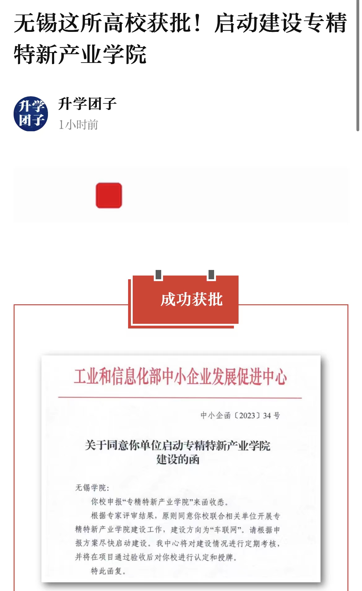 近日,工业和信息化部中小企业发展促进中心公布首批“专精特新产业学院”建设名单,无锡学院成功获批“专精特新产业学院”建设单位。