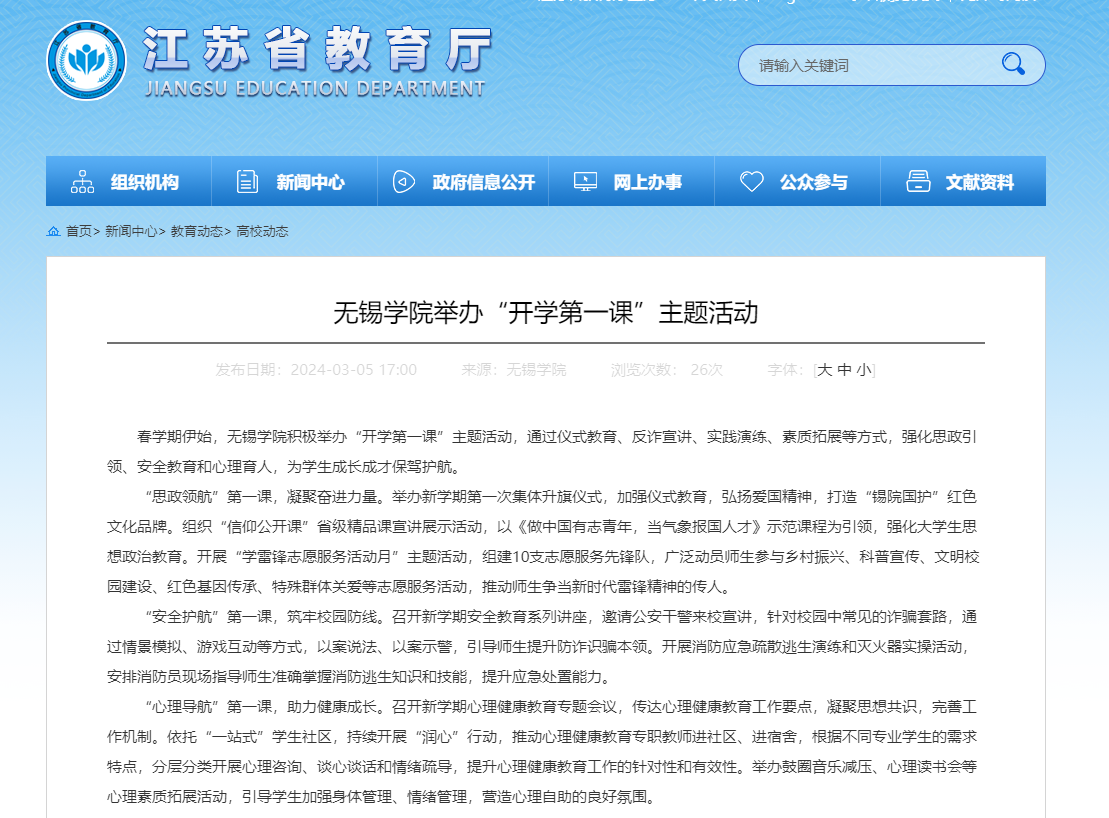 春学期伊始,无锡学院积极举办“开学第一课”主题活动,通过仪式教育、反诈宣讲、实践演练、素质拓展等方式,强化思政引领、安全教育和心理育人,为学生成长成才保驾护航。