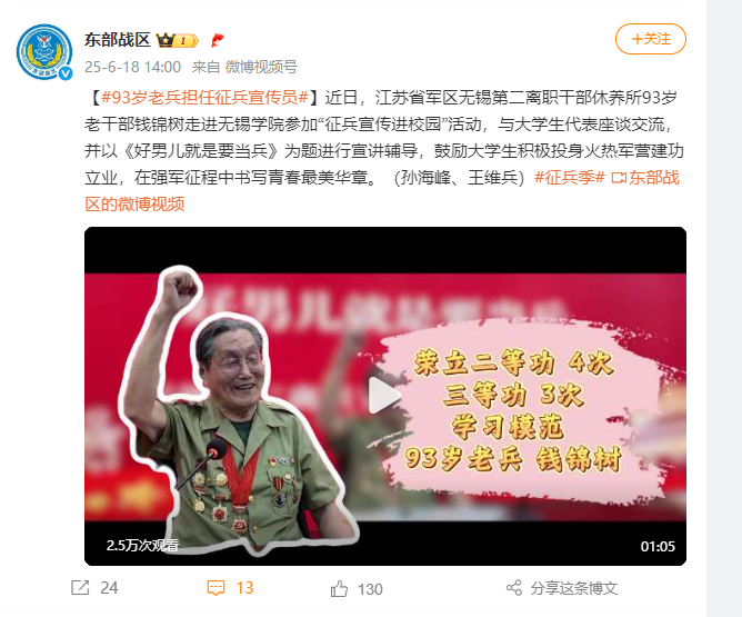 近日,江苏省军区无锡第二离职干部休养所93岁老干部钱锦树走进无锡学院参加“征兵宣传进校园”活动,与大学生代表座谈交流,并以《好男儿就是要当兵》为题进行宣讲辅导,鼓励大学生积极投身火热军营建功立业,在强军征程中书写青春最美华章。