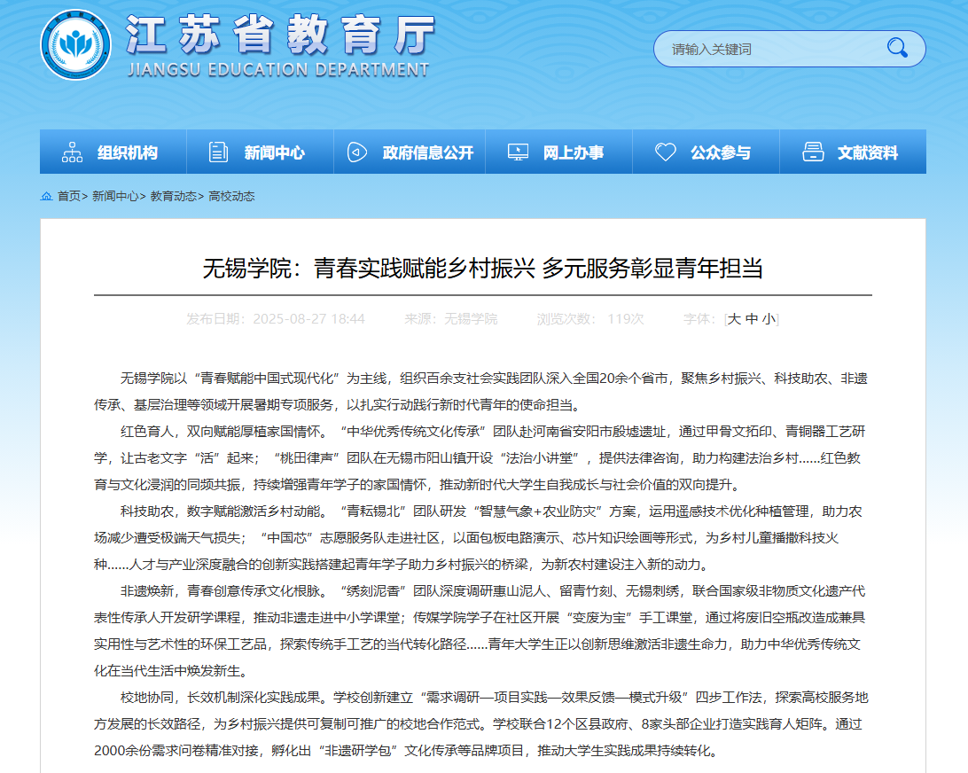 无锡学院以“青春赋能中国式现代化”为主线,组织百余支社会实践团队深入全国20余个省市,聚焦乡村振兴、科技助农、非遗传承、基层治理等领域开展暑期专项服务,以扎实行动践行新时代青年的使命担当。