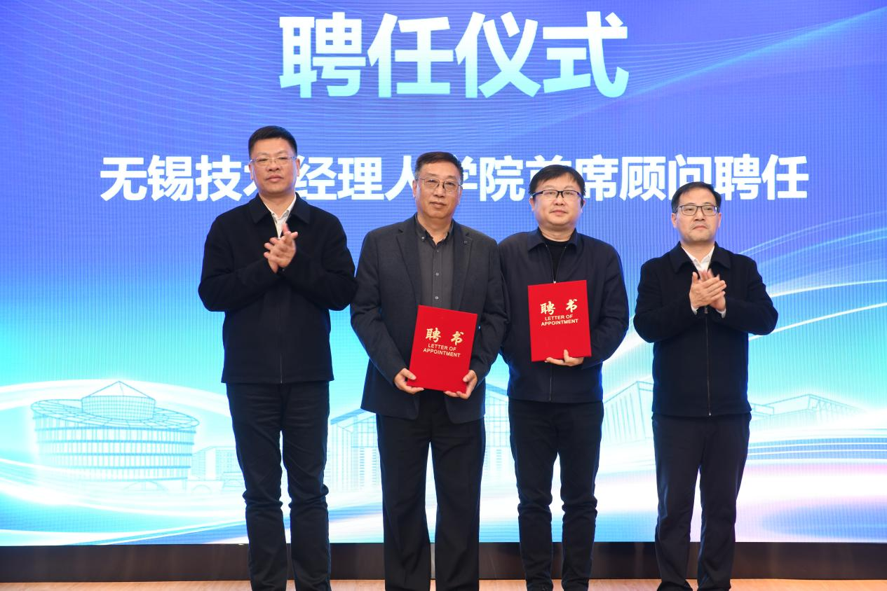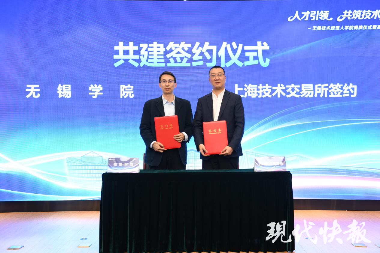 揭牌仪式环节,无锡技术经理人学院发布“技术经理人微专业”“技术经理人研究生课程”“上海交通大学技术经理人科创训练营”“无锡技术交易集市”四大品牌项目,无锡学院与上海技术交易所签署战略合作协议,江南大学国家大学科技园与无锡传感网国家大学科技园签署合作文件,无锡技术经理人学院首席顾问、院长、副院长及产业导师颁发聘书。