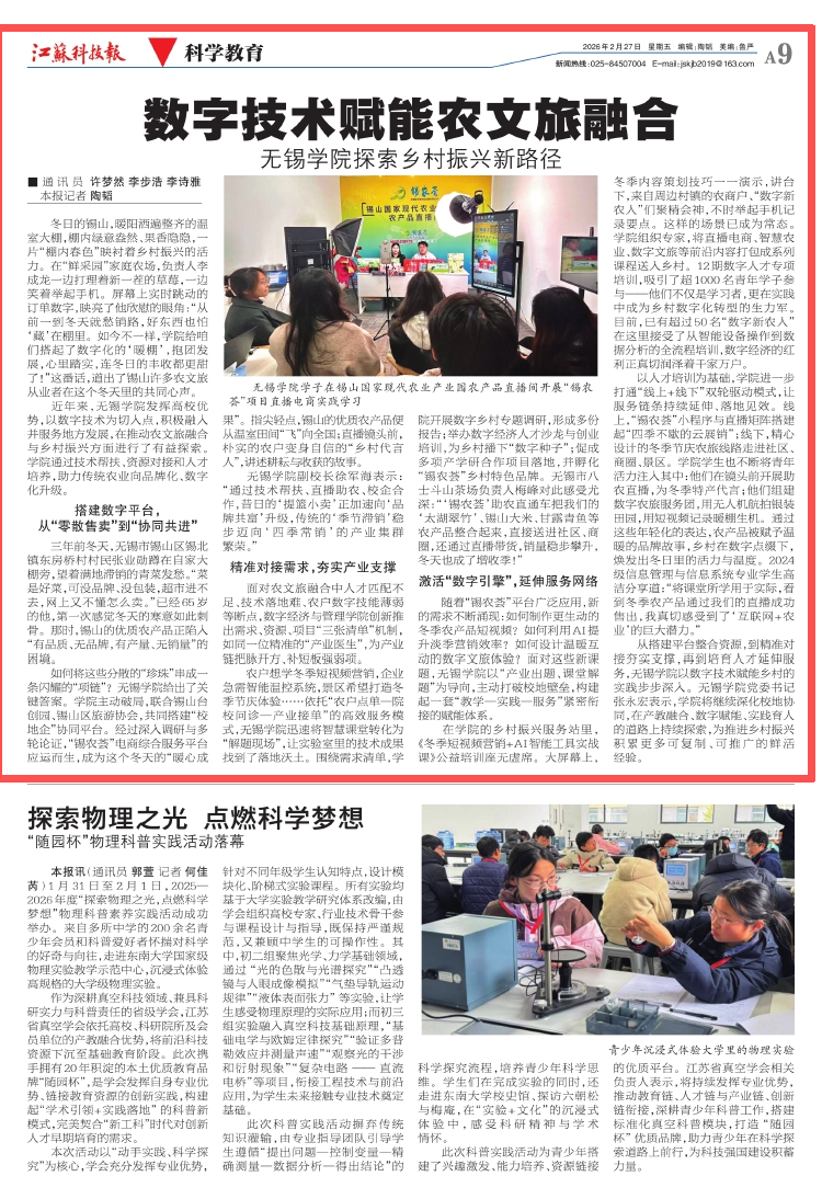 近年来,无锡学院发挥高校优势,以数字技术为切入点,积极融入并服务地方发展,在推动农文旅融合与乡村振兴方面进行了有益探索。学院通过技术帮扶、资源对接和人才培养,助力传统农业向品牌化、数字化升级。
