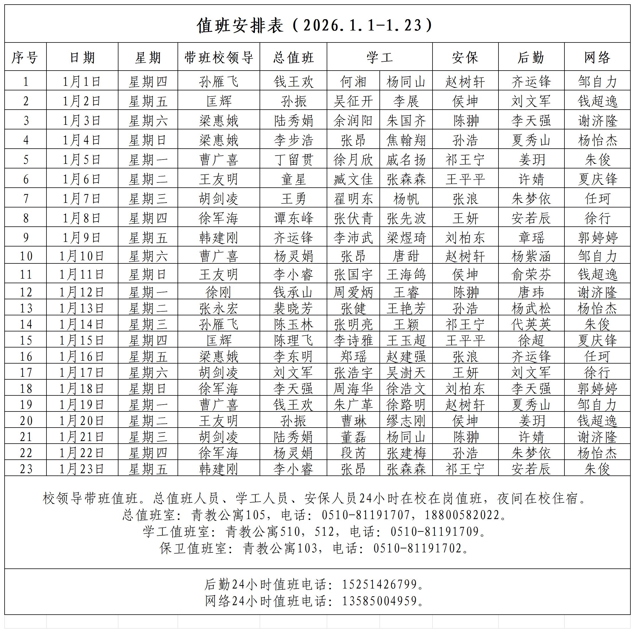 一月份值班安排表