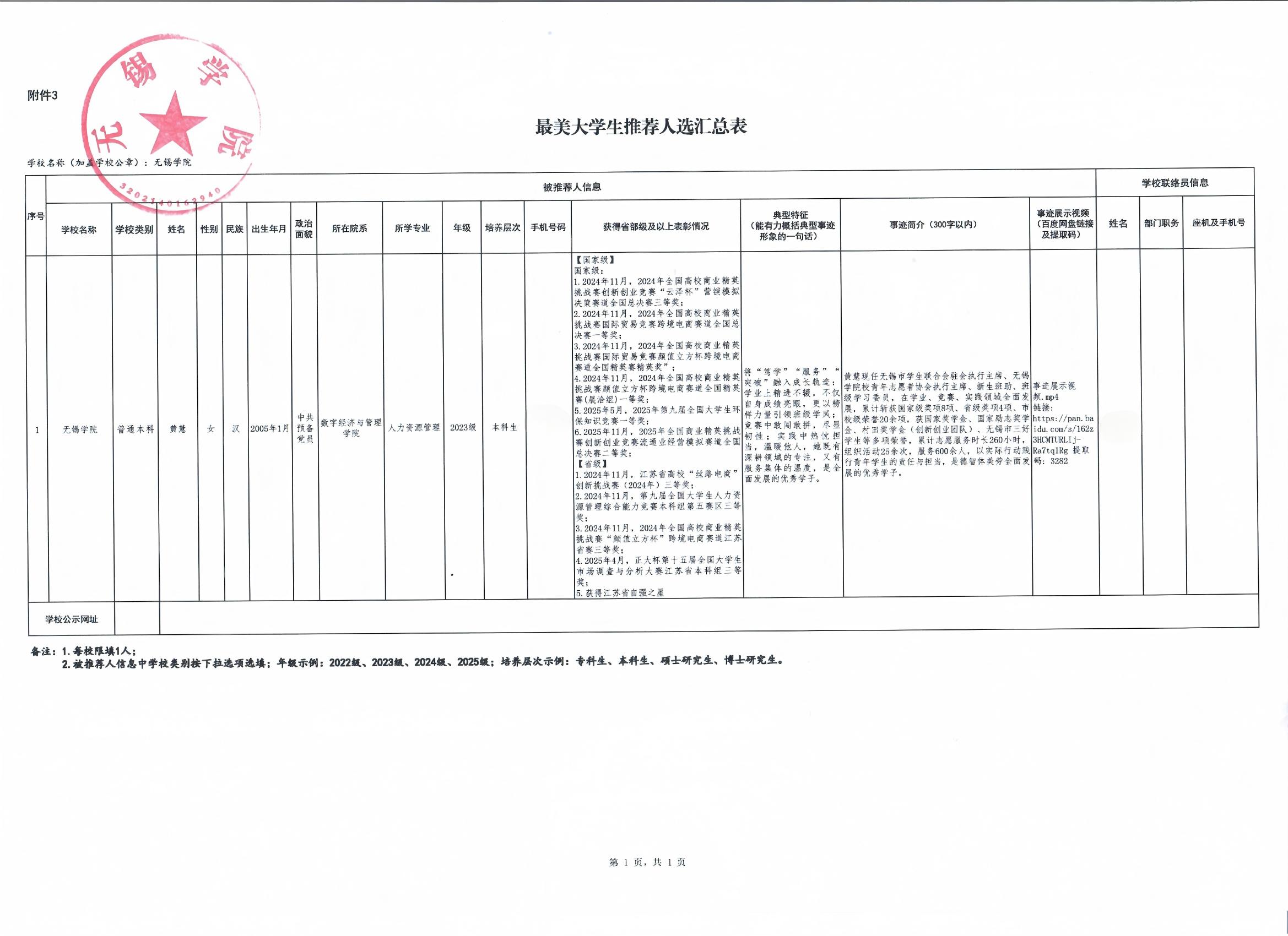 根据省教育厅办公室关于开展“最美大学生”推选展示活动通知,经个人申报、学院推荐、专家评审,拟推荐数字经济与管理学院人力资源管理专业2023级黄慧同学作为2026年“最美大学生”推荐人选,现予以公示。