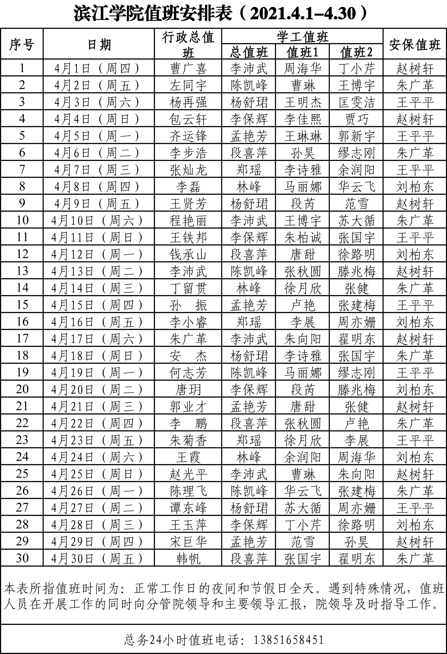 滨江学院值班安排表(2021.4.1-4.30)