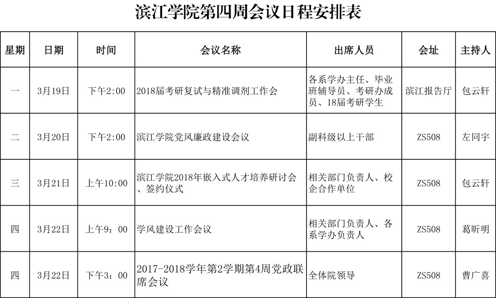 滨江学院第四周会议日程安排表