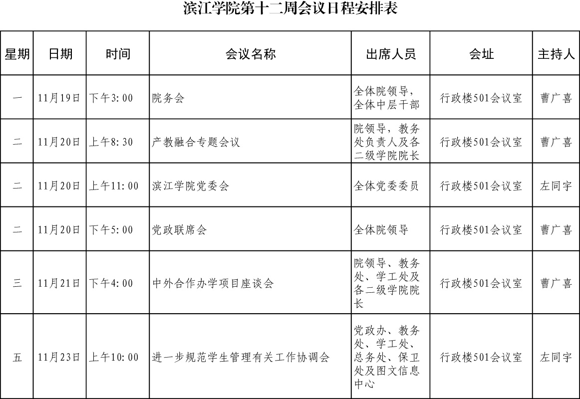 滨江学院第十二周会议日程安排表