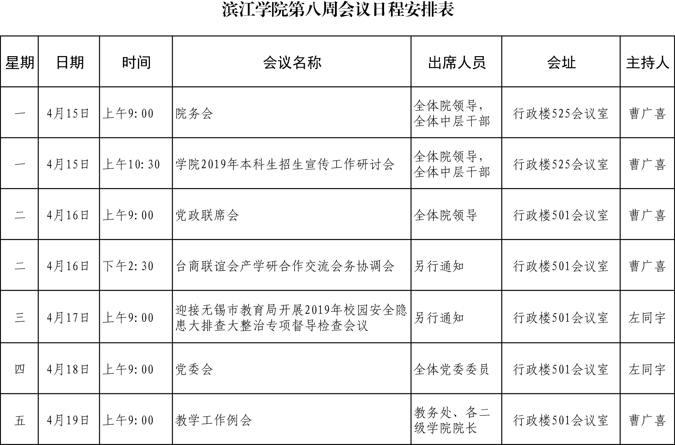 滨江学院第八周会议日程安排表