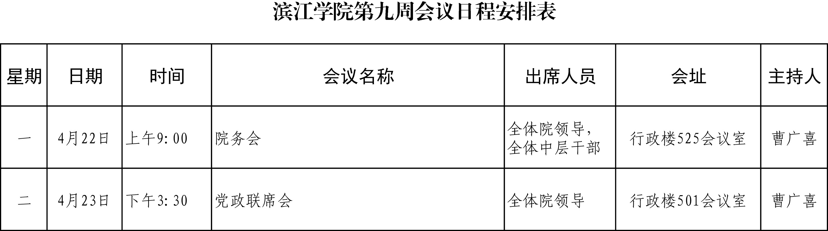 滨江学院第九周会议日程安排表