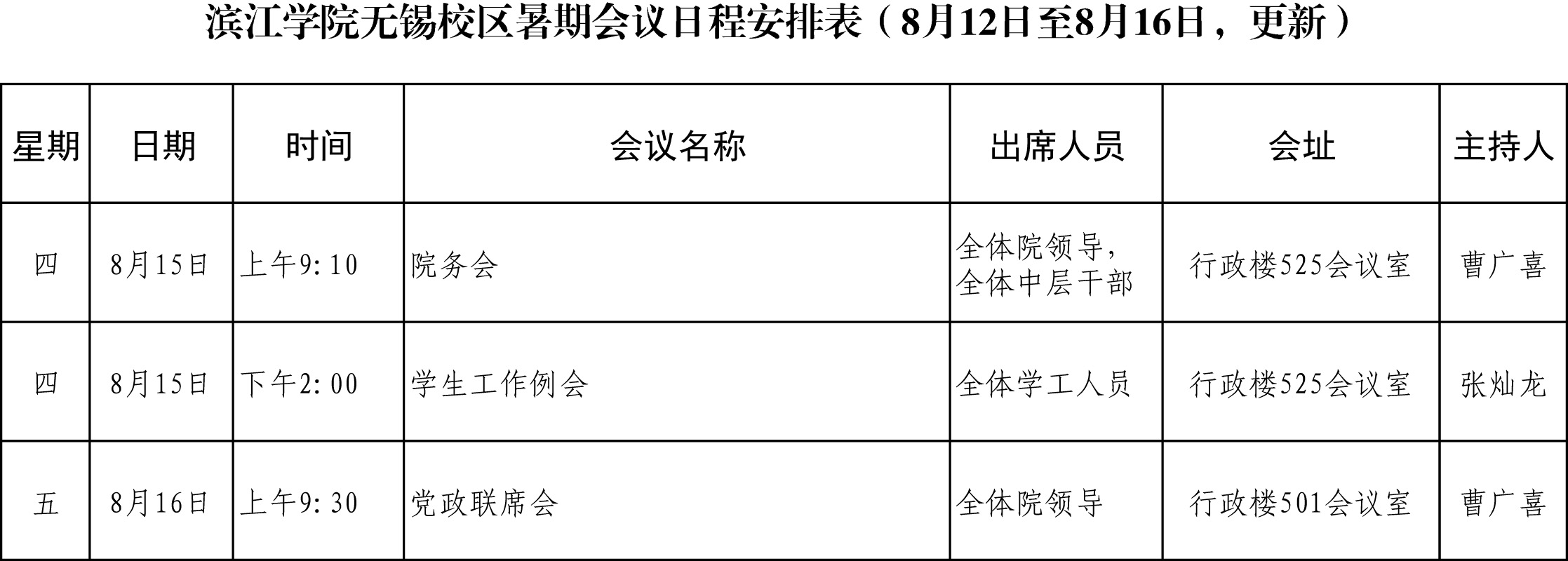 滨江学院暑期会议日程安排表(8月12日至8月16日,更新)