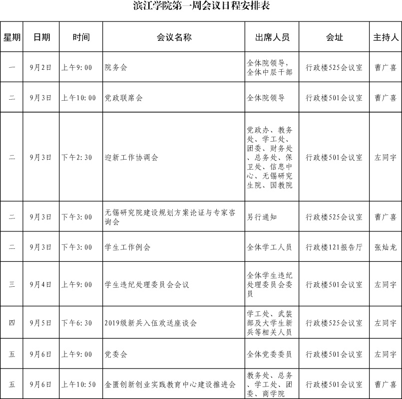 滨江学院第一周会议日程安排表