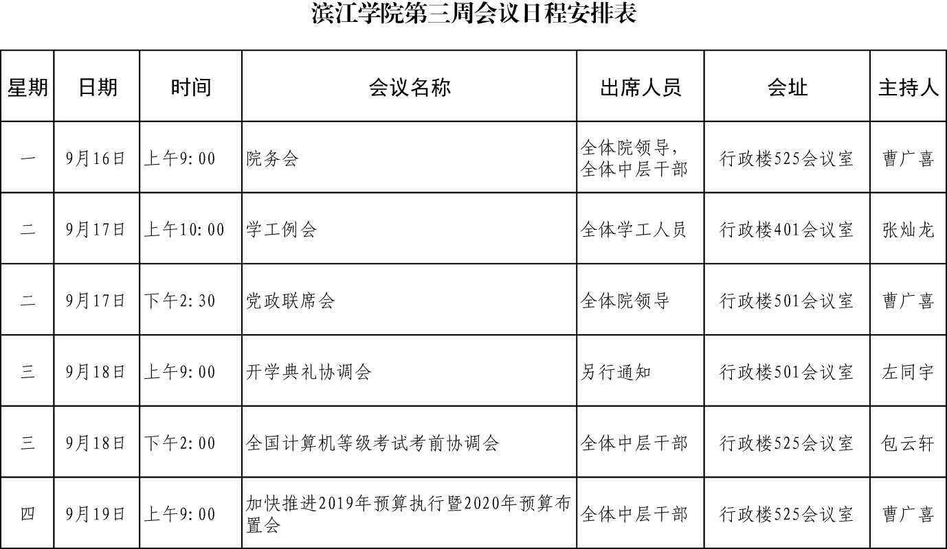 滨江学院第三周会议日程安排表