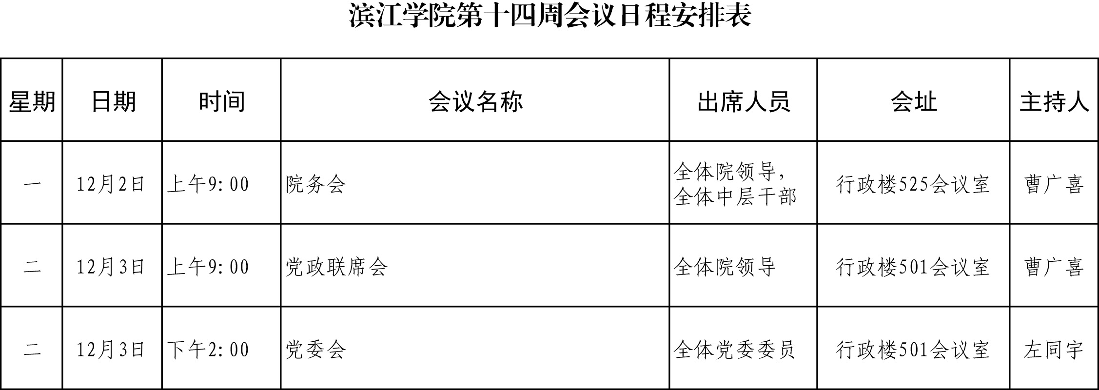 滨江学院第十四周会议日程安排表