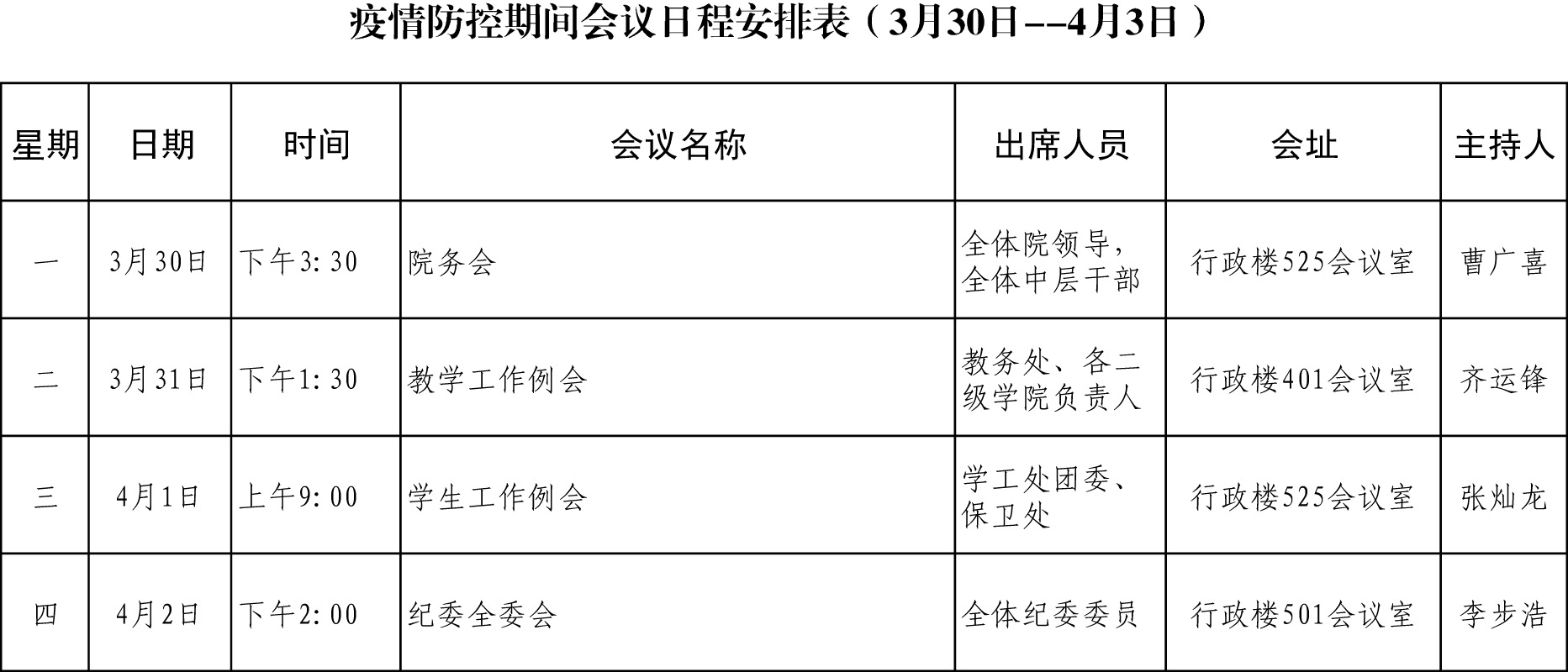 疫情防控期间会议日程安排表(3月30日--4月3日)