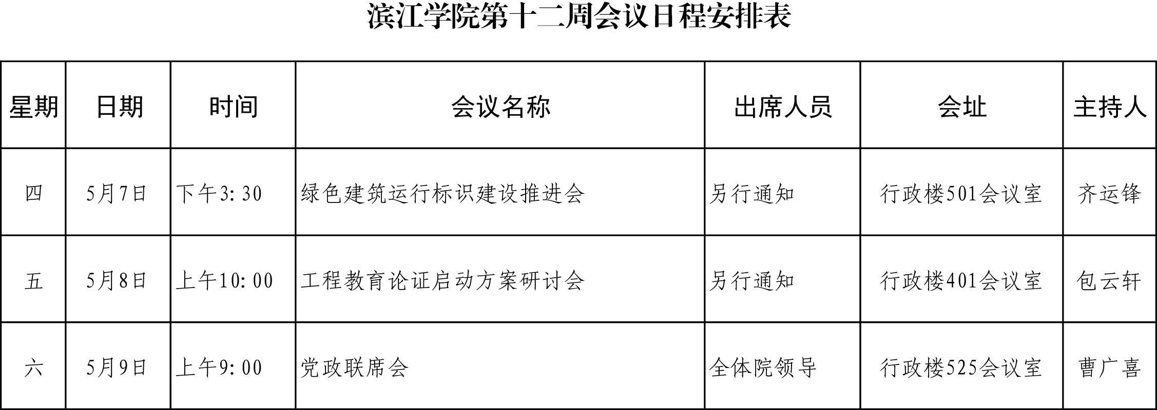 滨江学院第十二周会议日程安排表