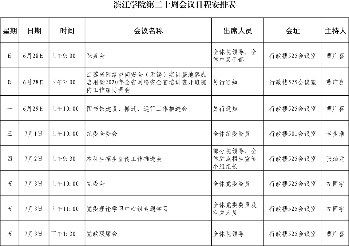 滨江学院第二十周会议日程安排表