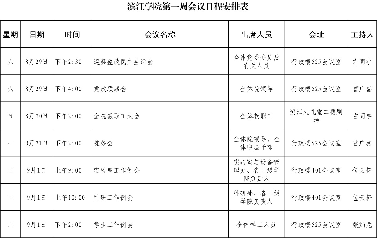 滨江学院第一周会议日程安排表