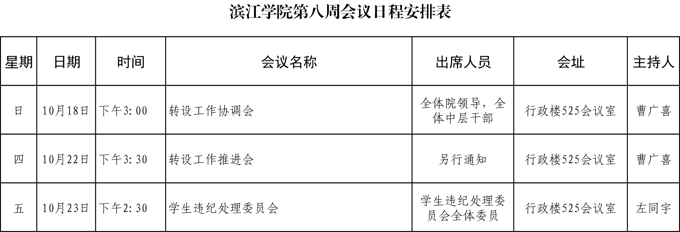 滨江学院第八周会议日程安排表