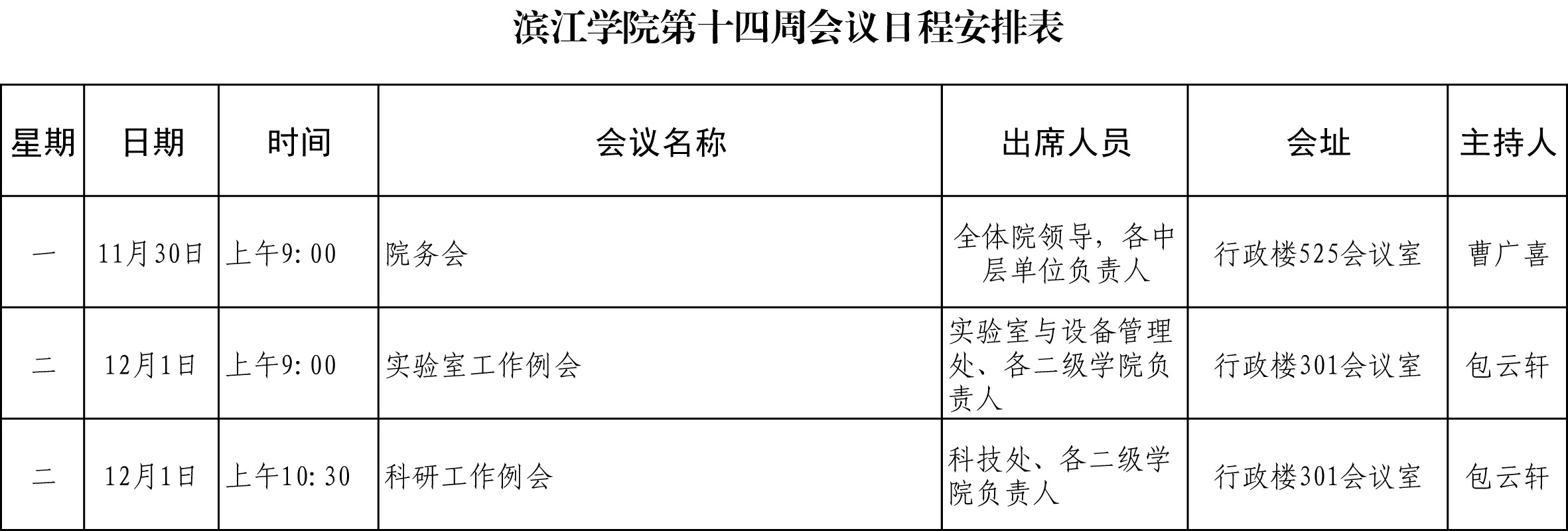 滨江学院第十四周会议日程安排表