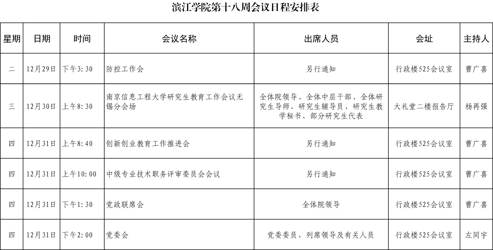 滨江学院第十八周会议日程安排表