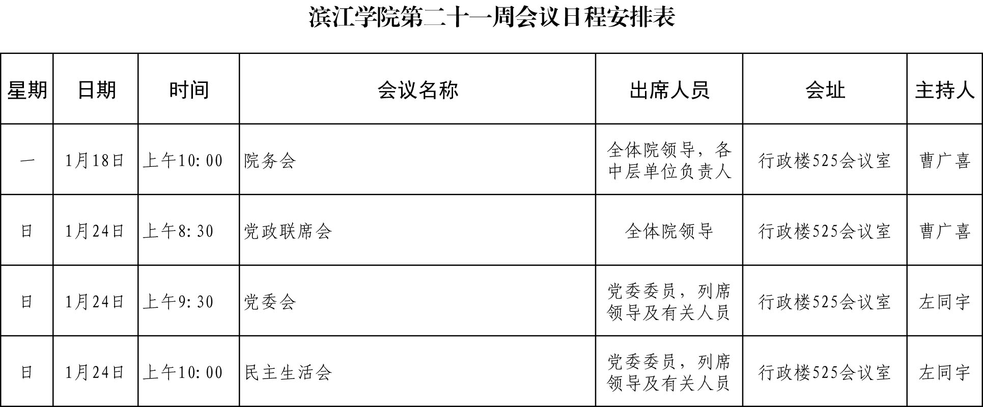 滨江学院第二十一周会议日程安排表