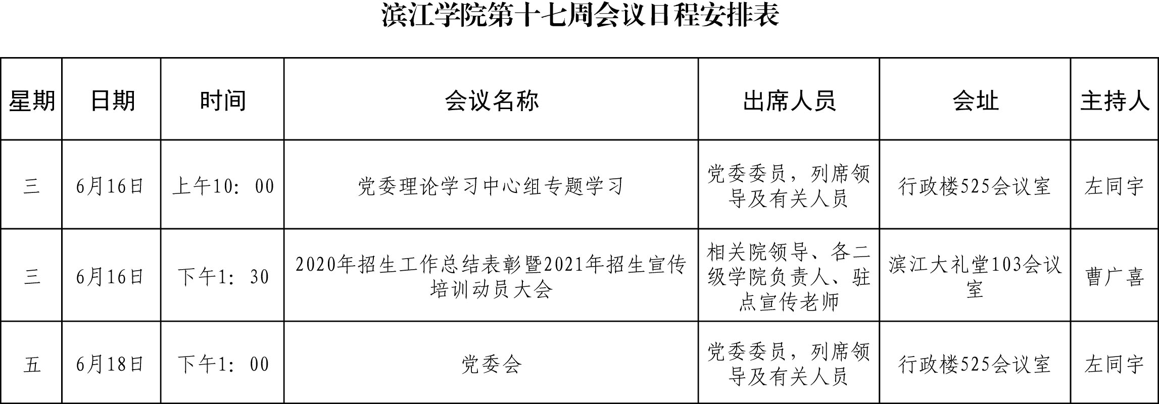 滨江学院第十七周会议日程安排表