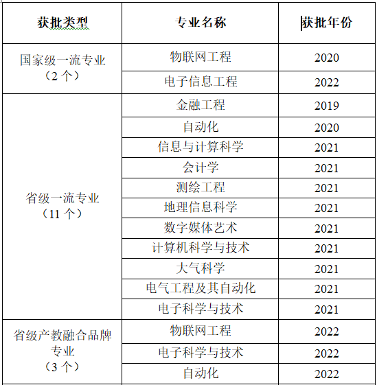 树立一流意识,专业建设成效显著。教务处将打造鲜明办学特色和培育优势学科专业作为提升核心竞争力的工作主线,把服务国家战略和无锡经济社会发展作为可持续创新发展的动力源泉。继物联网工程专业获批国家一流之后,我校电子信息工程获批国家一流本科专业,计算机科学与技术、会计学等9个专业获批2021年度省级一流本科专业。截至目前,我校共有国家一流专业建设点2个,省级一流专业建设点11个。