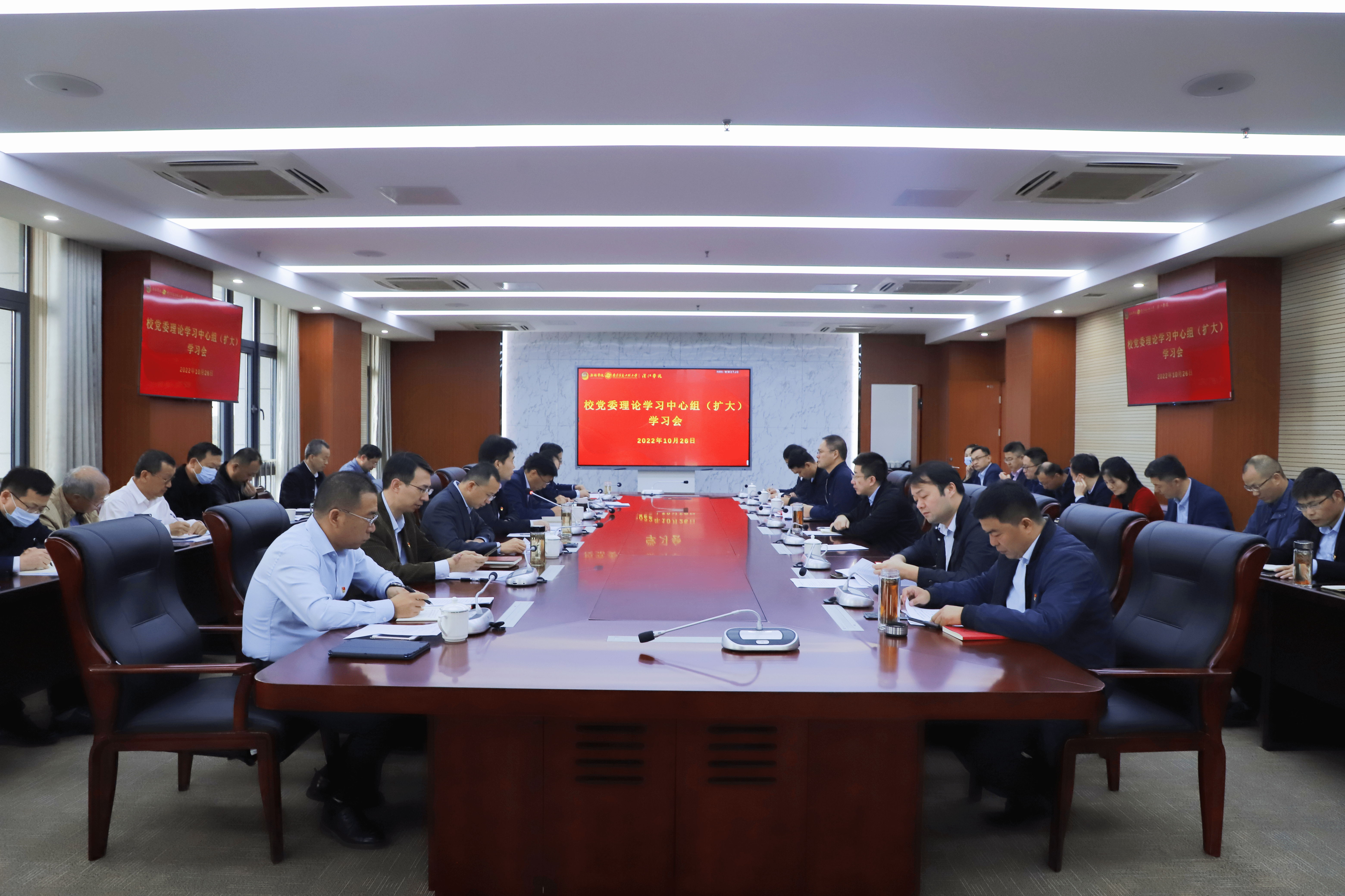 10月26日上午,我校在行政楼327会议室召开校党委理论学习中心组(扩大)学习会,集中学习党的二十大精神,部署学习宣传贯彻各项工作。全体校领导、中层单位负责人参会学习。学习会由校党委书记杨建新主持。