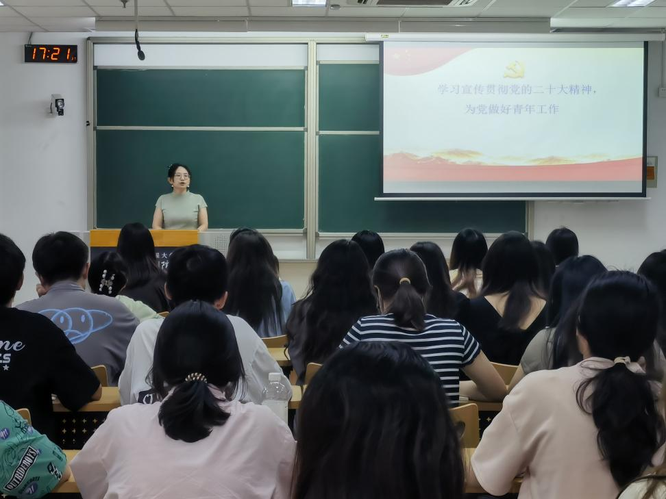 为学习贯彻党的二十大精神,推动习近平新时代中国特色社会主义思想入脑入心化形,6月20日,数字经济与管理学院党总支副书记李诗雅以《学习宣传贯彻党的二十大精神,为党做好青年工作》为题,为学院2023上半年发展的入党积极分子讲授专题党课。